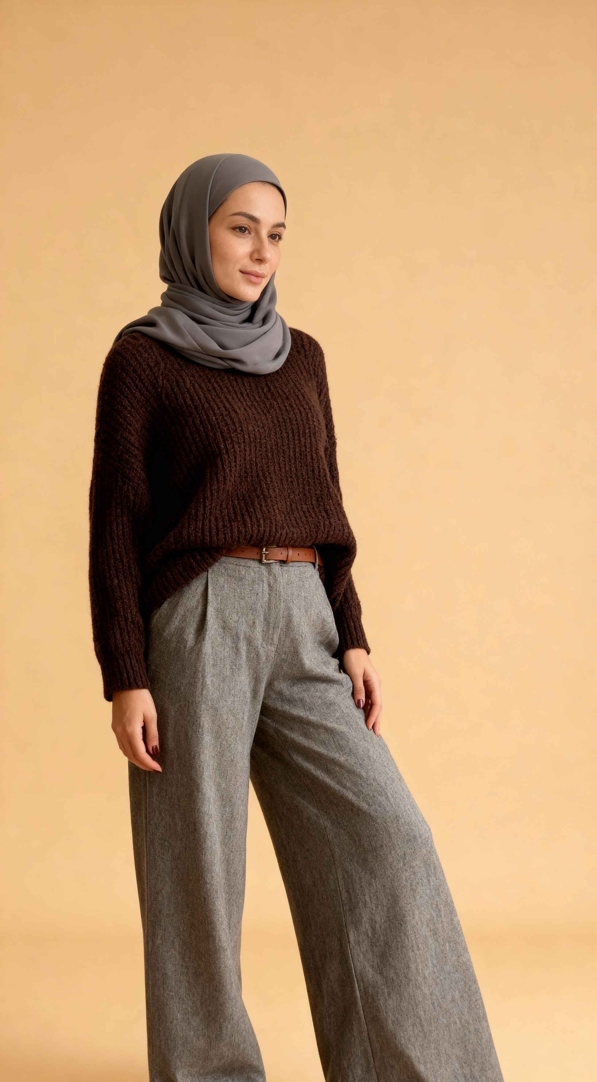 Alaca pantolon, dökümlü dokusu ve yüksek bel formu ile gün boyu konfor sunarken, İslami giyimin asaletiyle buluşur.
